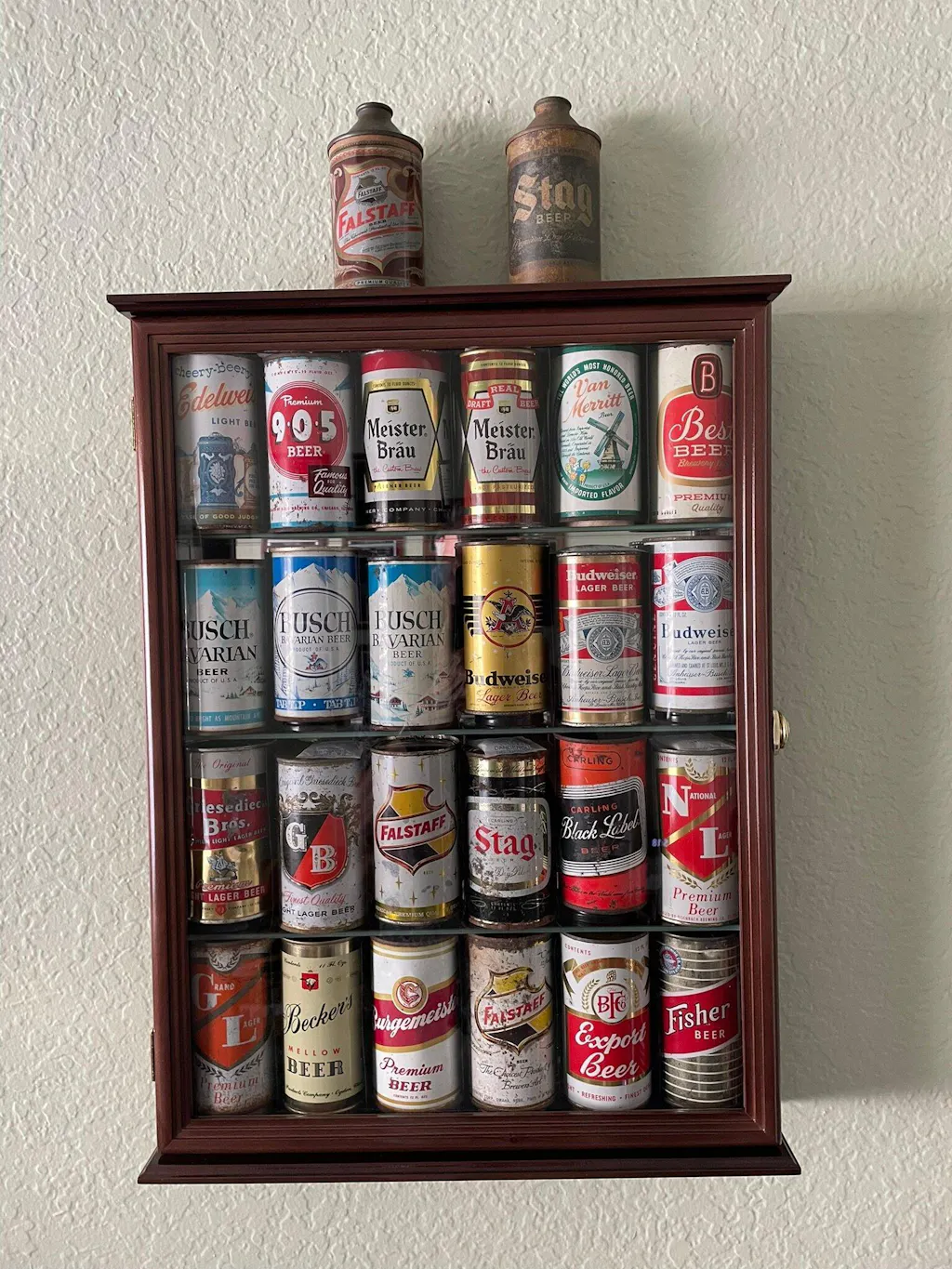 This is an incredible display case for 24 vintage beer cans! It looks amazing. I get compliments from everyone who sees it. Only one issue - it does not fit 24 vintage beer cans. Why would anyone want to display modern aluminum cans? The beauty of this case demands museum pieces. The average rim diameter of my 24 1950 flat top cans is 2.673" and each shelf length is 15.93". If you push really hard you can get 6 cans across but you'll have dents and scratches. I built little stands to raise every other can so the rims could clear. Then I put back cardstock between each cans. However, if I raised the top shelf cans the door wouldn't close so the smallest diameters moved to the top. I had to build taller stands for all bottom cans so the door would close. To be properly engineered, the shelves need to be a bit deeper and longer. Cone tops? Forget about it, the have to go on top like a shelf - no protection :-(. This is so close to being the perfect display for vintage beer cans. Unfortunately, the short comings risk damaging your museum pieces. I would be happy to purchase a slightly larger version!!